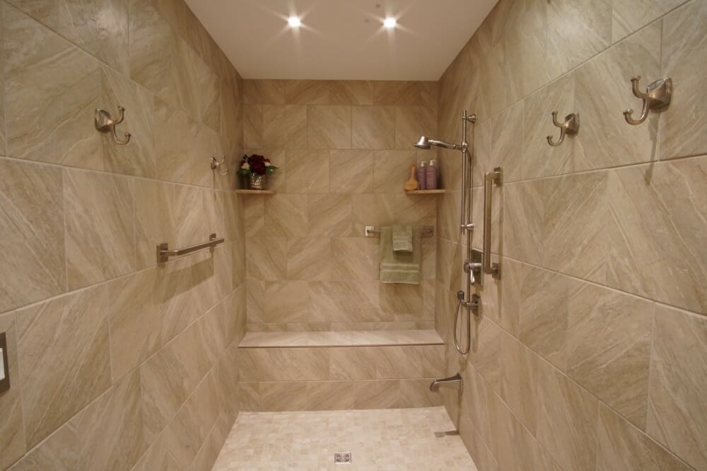 This Aging in Place master bath created by JOMA Construction features a curb-less roll-in shower, reinforced grab handles/towel bars, a shower wand, levered fixtures, a widened door frame, motion sensor lighting, and enough space for a wheel chair to turn around. They made sure their homeowner had a safe and beautiful bathroom to enjoy.